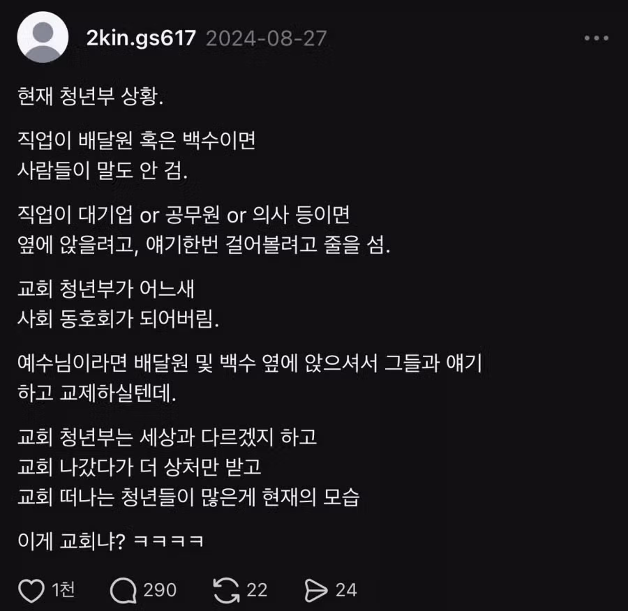 예전부터 교회는 인맥 쌓으러 가던건데.. 이제 나이대가 점점 내려올뿐임 누가 예수 믿으러 가나