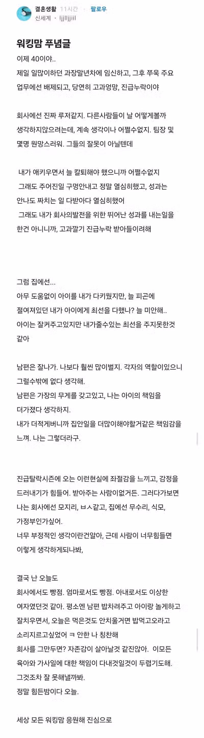블라에서 이슈중인 워킹맘 푸념(맞벌이 워킹맘의 현실)