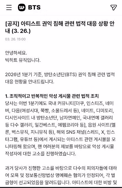 HYBE, BTS 광화문 콘서트 관련 모든 한국 커뮤니티 대상 소송 발표.