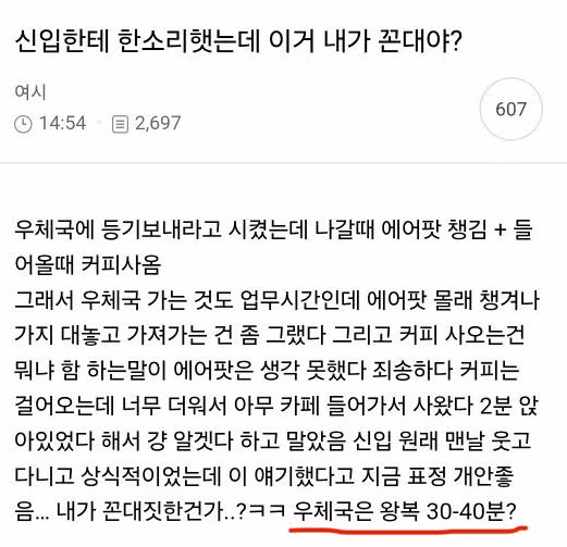 ??????? 뭔 상관이야 시팔 내가 씹꼰대 회사 다니는데, 저런 출장이나 업무 갈 때마다 걍 눈치껏 쉬다 오라 하는데. 글고 저정도 거리면 시발 카드 주면서 커피라도 사 마시라고 한다 아니면 걍 택시타고 갔다오라 하거나