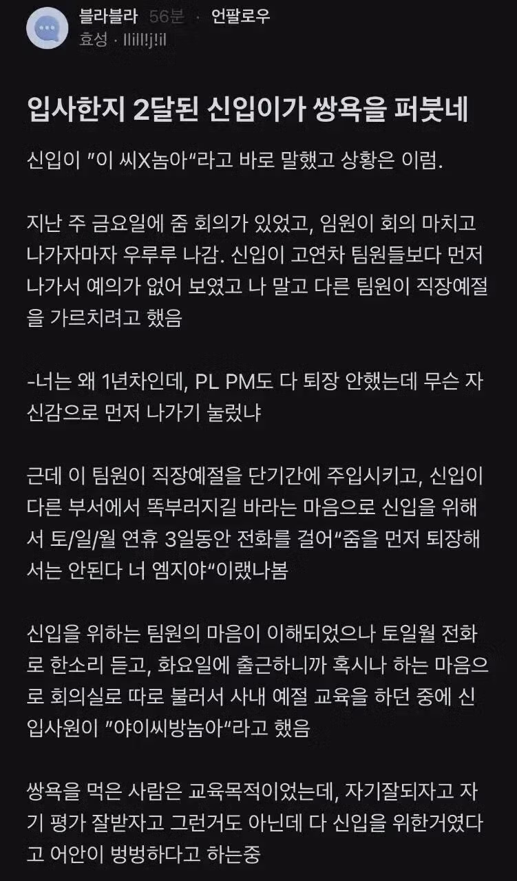입사한지 2개월만에 회사동료에게 씨발놈아 한사람