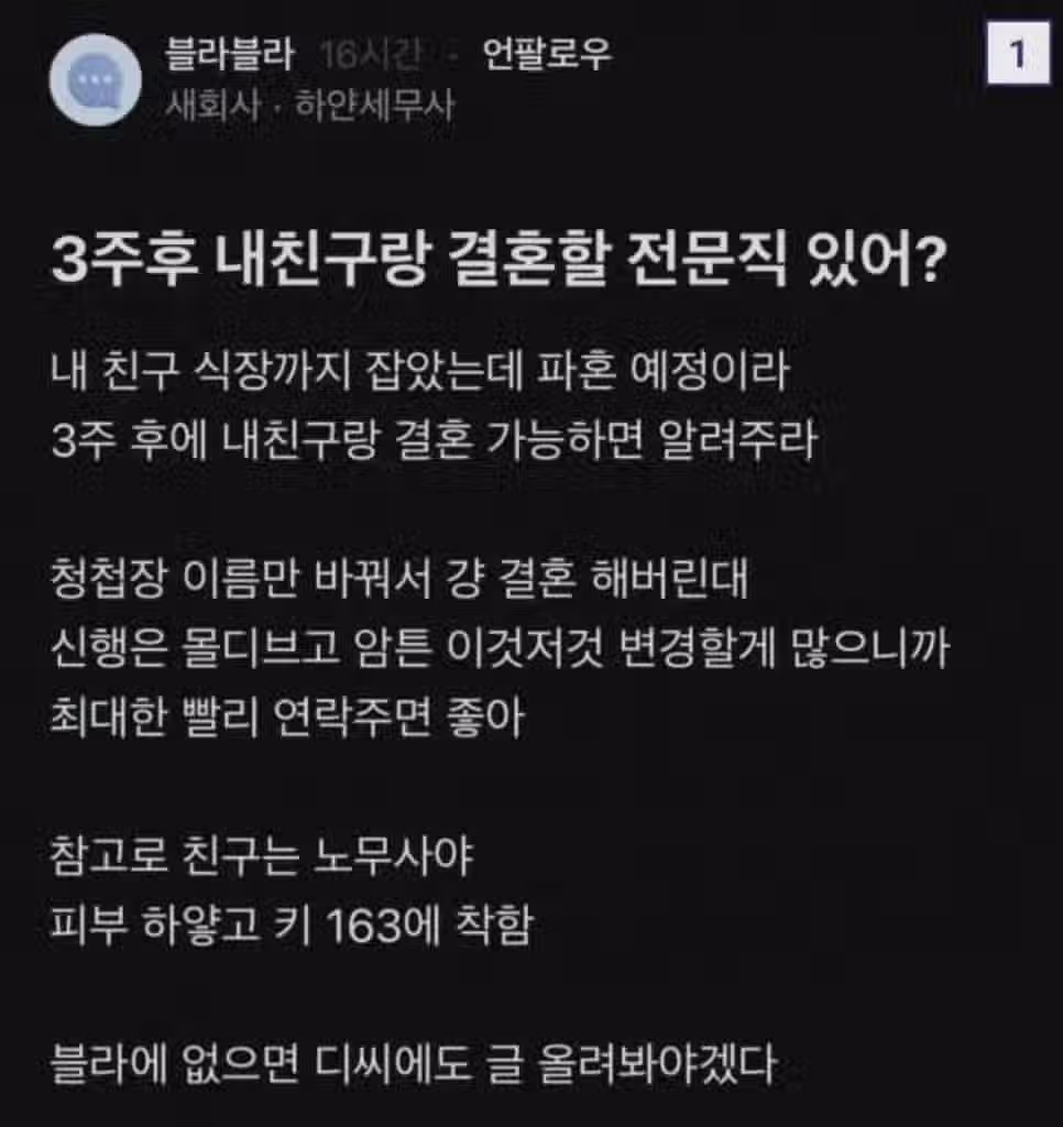 3주 후 내 친구랑 결혼할 전문직 있어?