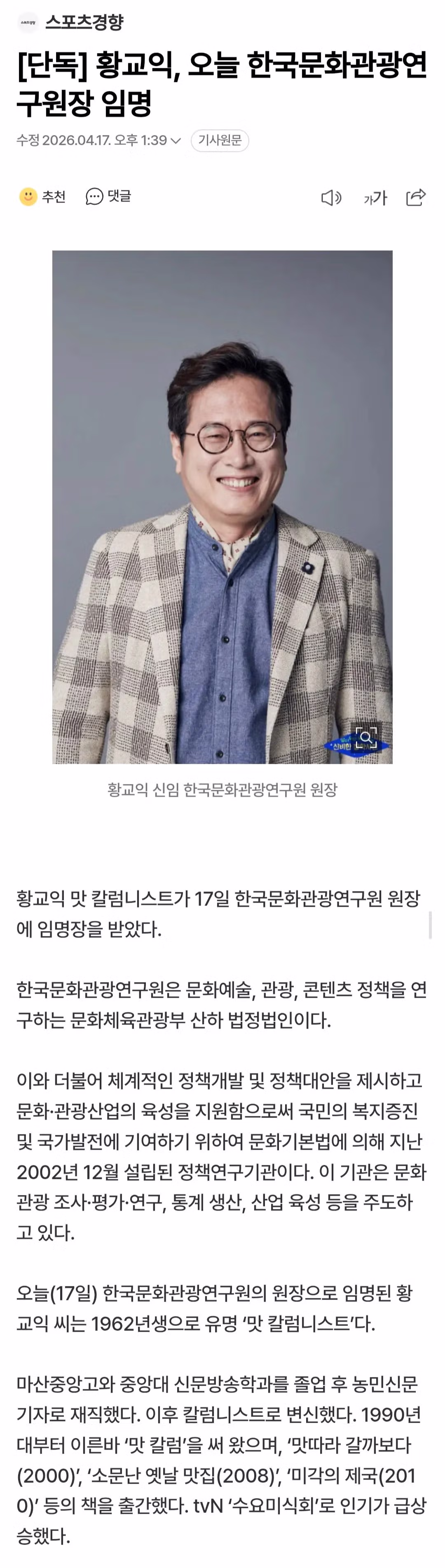 [단독] 황교익, 오늘 한국문화관광연구원장 임명