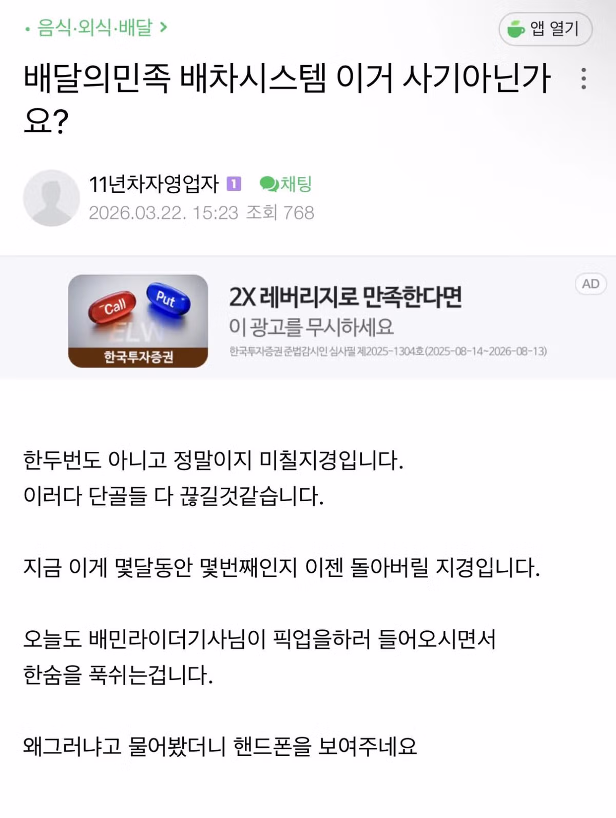 배민 한집배달 했는데도배차잡히는데 30분걸림ㅋㅋㅋㅋㅋㅋㅋㅋㅋㅋ배민 삭제함