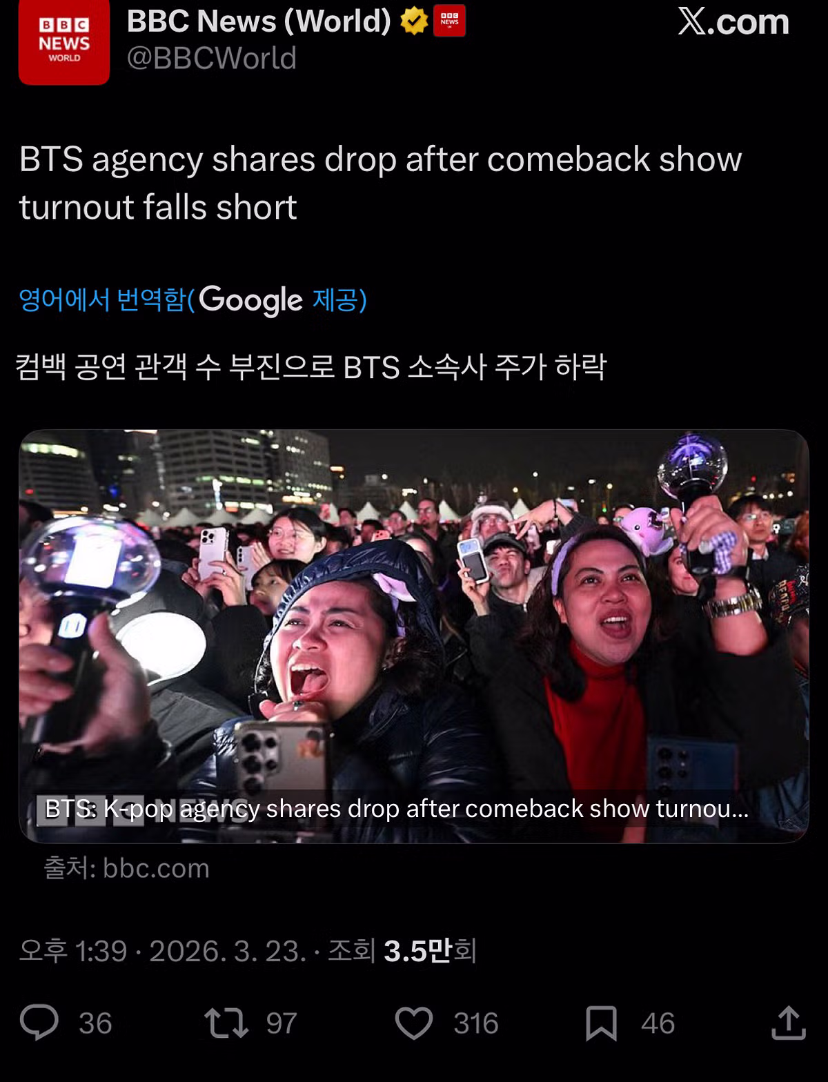 BBC : 컴백 공연 관객수 부진으로 BTS 소속사 주가 하락