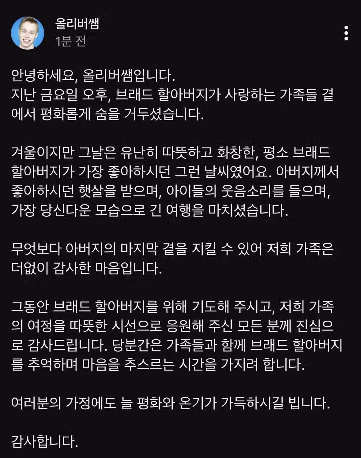 유튜버 올리버쌤 브래드 할아버지 별세