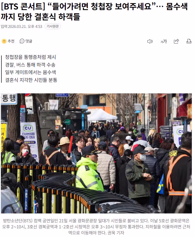 [BTS 콘서트] “들어가려면 청첩장 보여주세요”… 몸수색까지 당한 결혼식 하객들