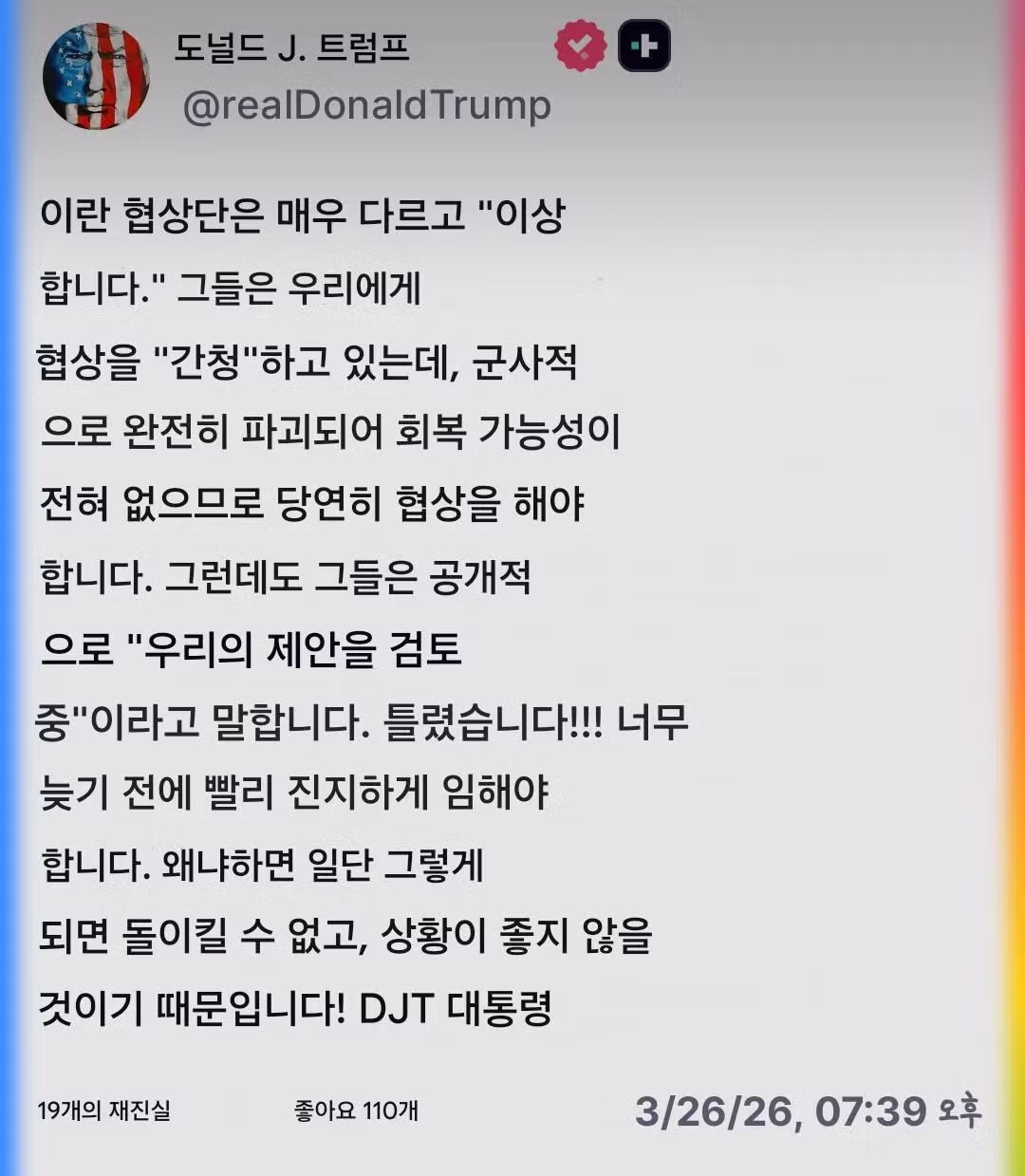 속보)트럼프: 이란 너네 협상 간청하고 있으면서 왜 안그런척해