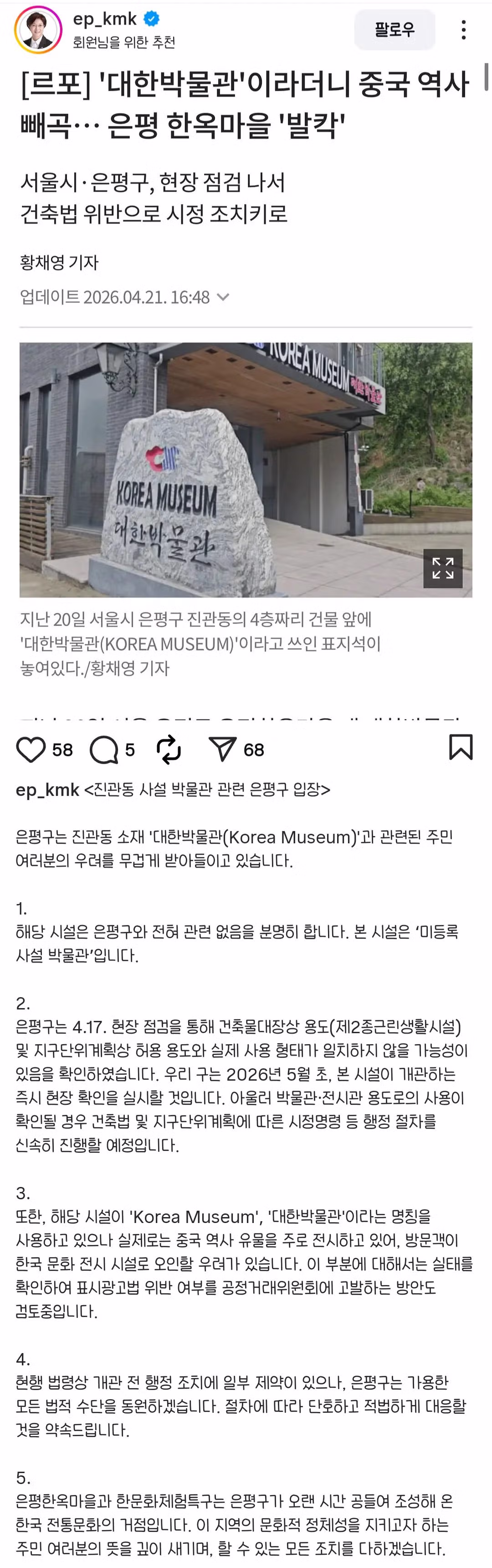 며칠 전 포텐에 올라온 은평한옥마을 박물관 은평구청장 입장문