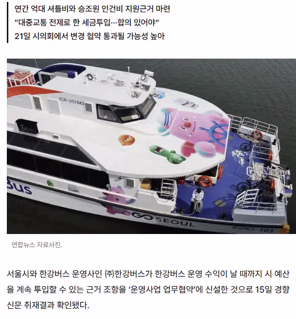 시 관계자는 “한강버스를 대중교통이라고 판단해 지원하는 것”이라며 “추계한 셔틀버스 운영비는 연간 6억3000만원으로, 올해부터 한강버스가 흑자를 낼 때까지 매년 지원할 계획”이라고 말했다.