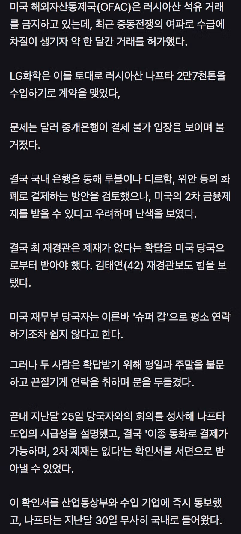 '러産 나프타 2.7만톤' 막힌 결제길 뚫은 공무원 포상 추진🇰🇷