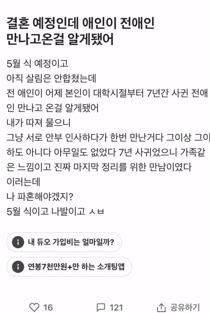 결혼전 전애인 만나고온 상대