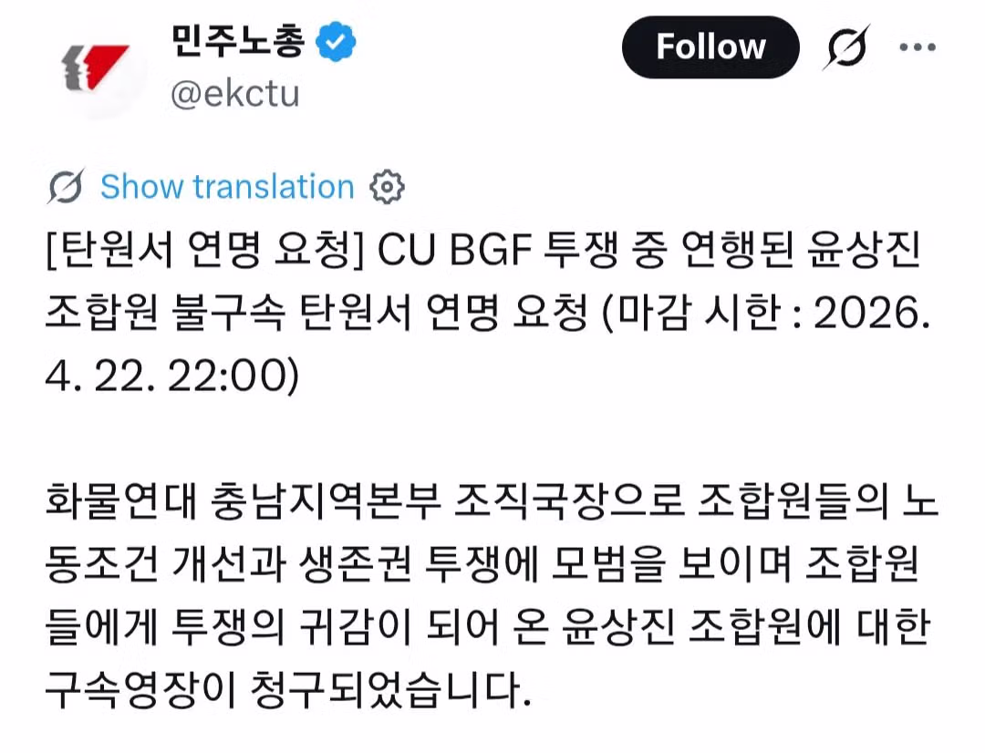 현재 민주노총에서 서명 중인 탄원서