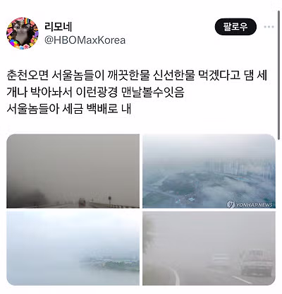 춘천 소양강댐 충주 충주댐 다 그러함 지역민들은 개피해보면서 살지만 댐 물 대부분은 수도권으로 공급하지..