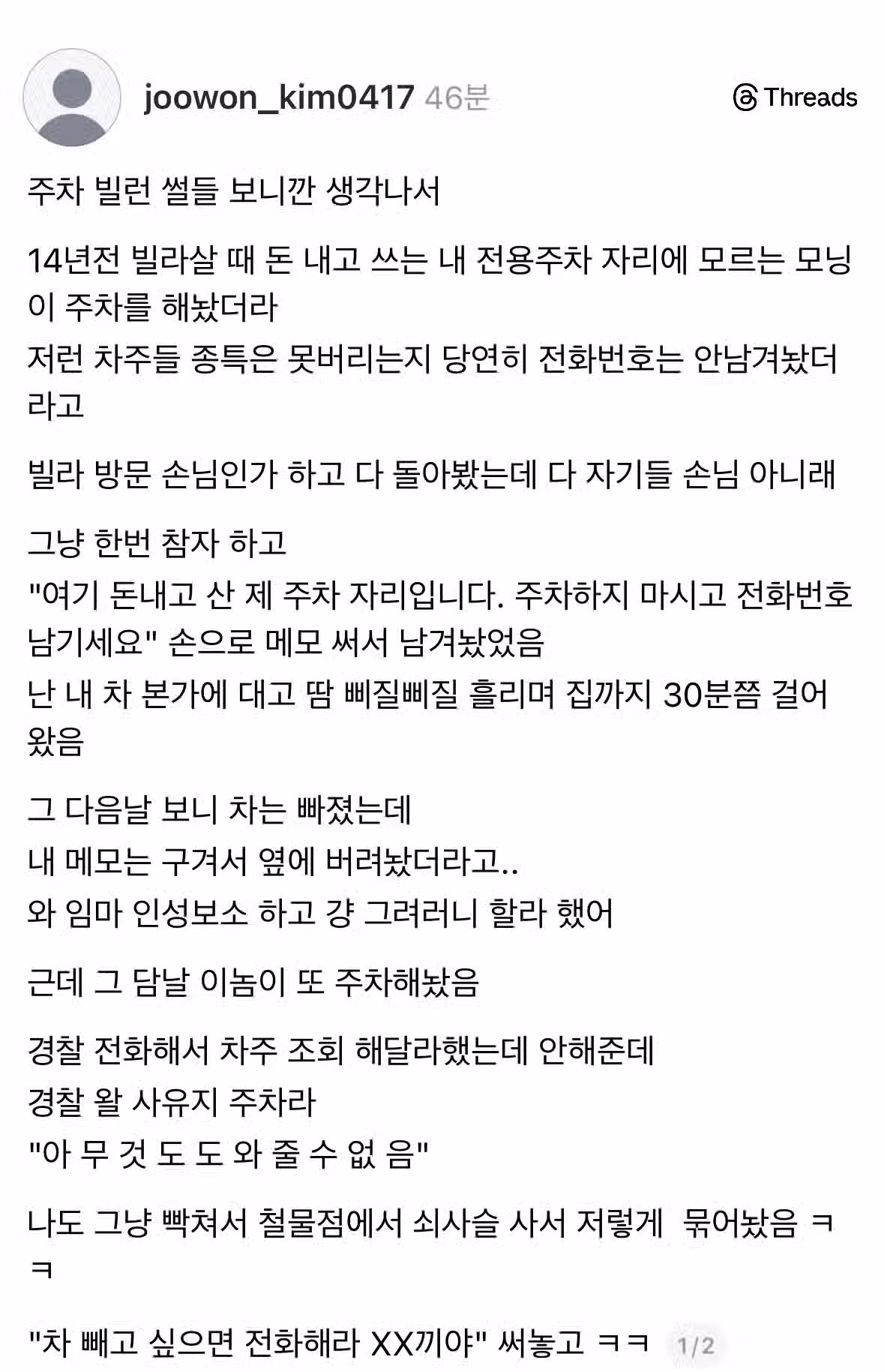 사유지 주차한 차량 쇠사슬로 묶었던 썰.Threads