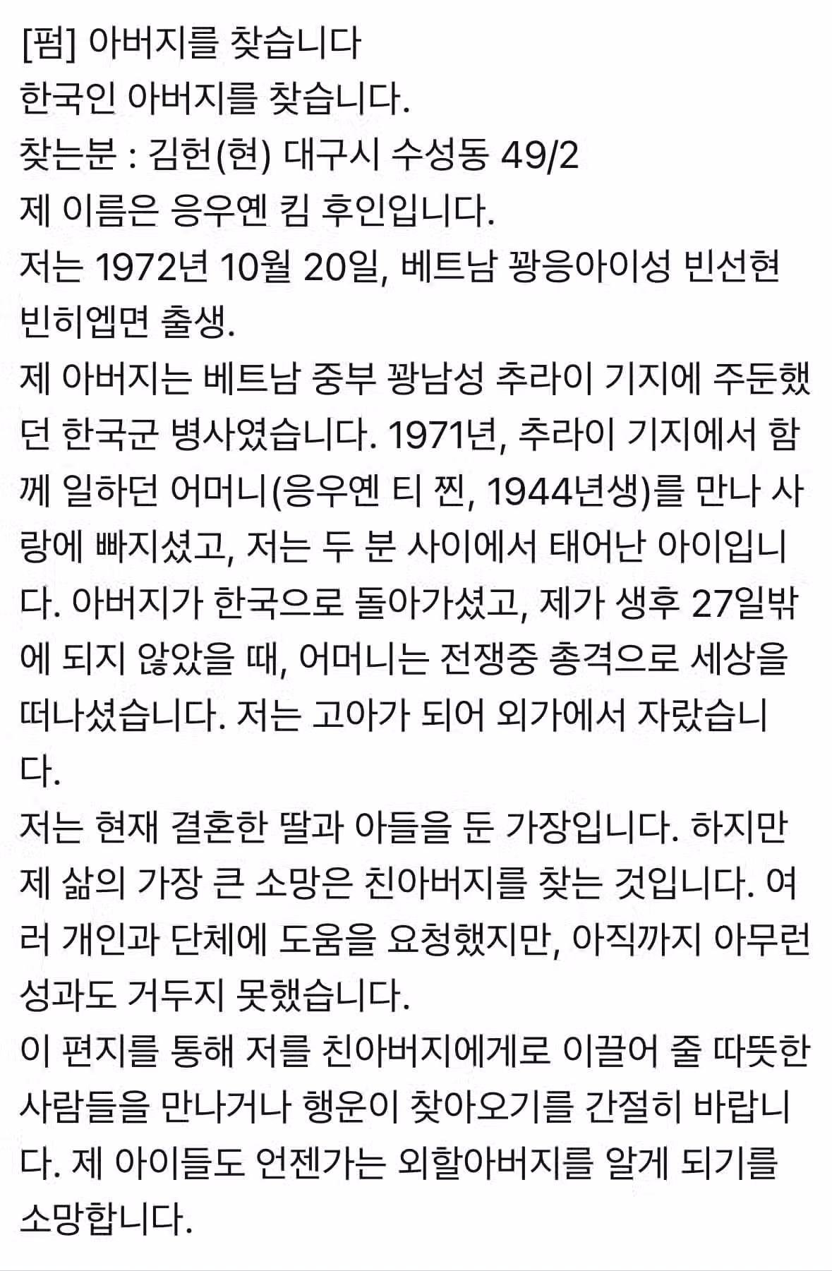 한국인 아버지를 찾고 있다는 베트남인