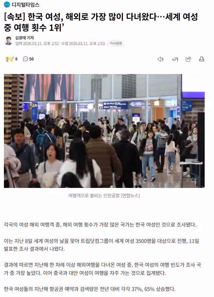 한국여성, 세계 여성 중에 여행 횟수 1위 등극