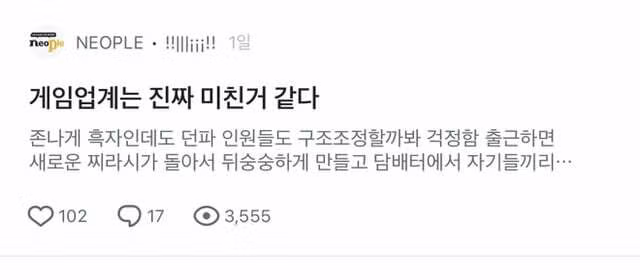 다른나라는 게임 만들때 리니지 라이크만 찍어대다가 터질때가 되서 터지는것 같긴한데 저들도 힘 없이 회사에서 시키는것만 하다 이제 장사 안되서 쫒겨나는거라 안쓰럽긴함... 그럼하지마 했던애는 아직 붙어 있으려나