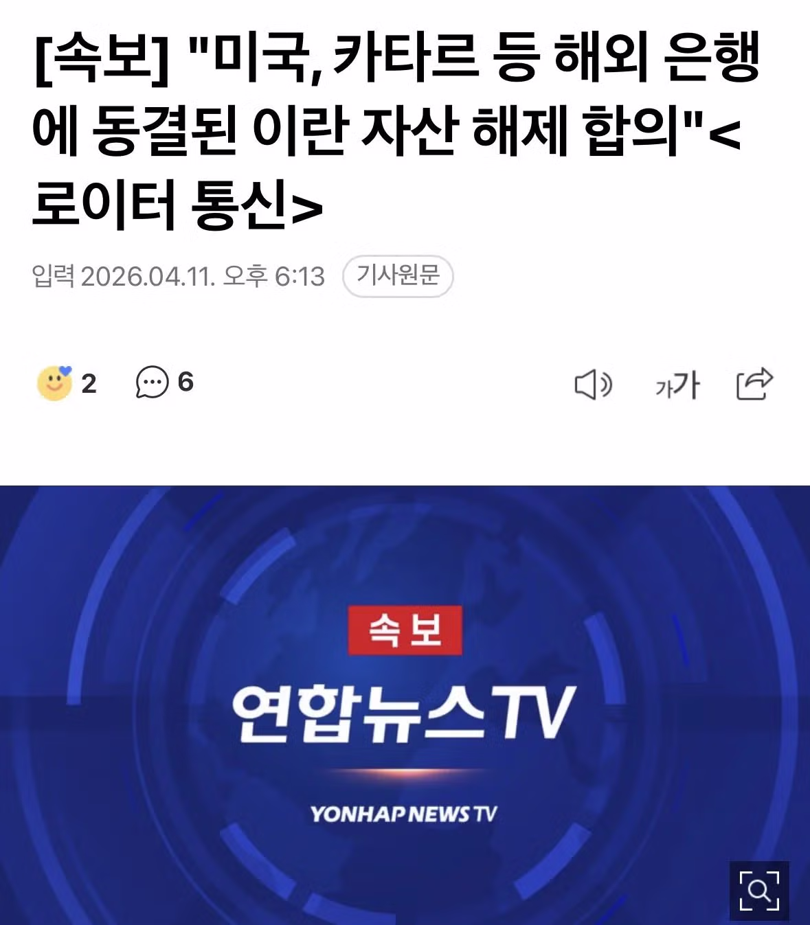 [속보] "미국, 카타르 등 해외 은행에 동결된 이란 자산 해제 합의"<로이터 통신>