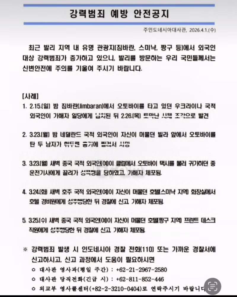 '발리, 안전한 휴양지 아닙니다', 대사관 공식경고