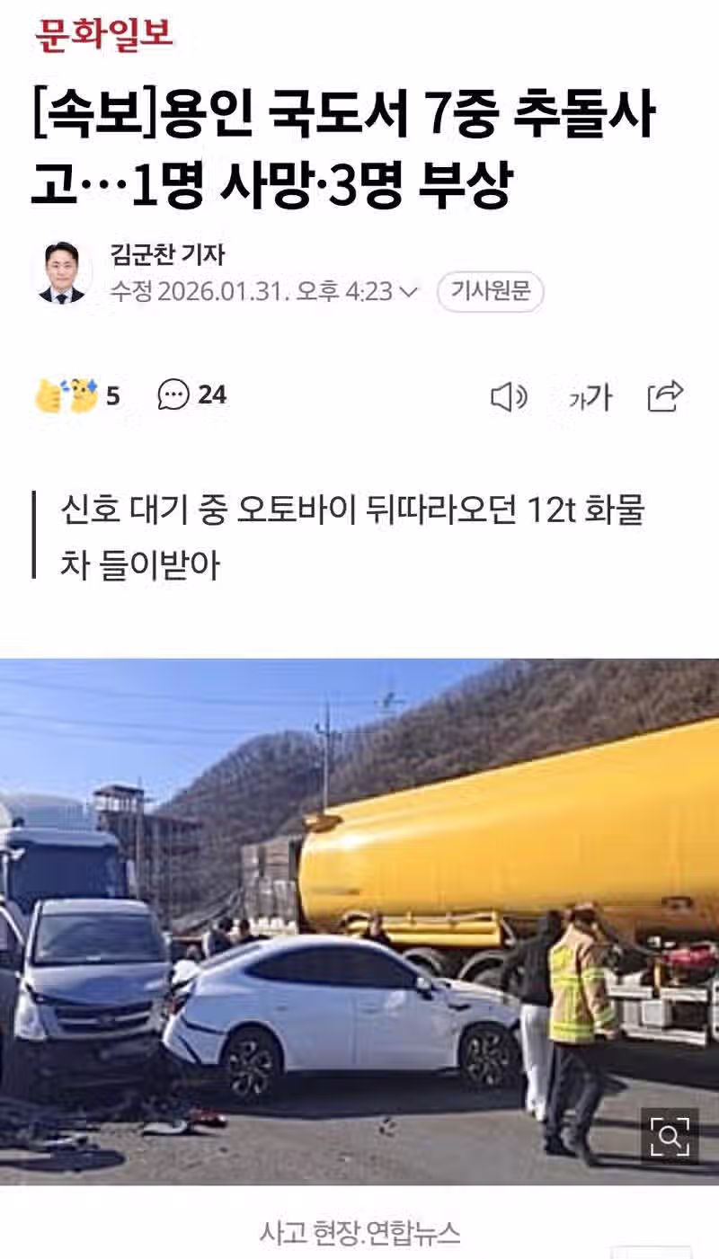속보]용인 국도서 7중 추돌사고1명 사망3명 부상