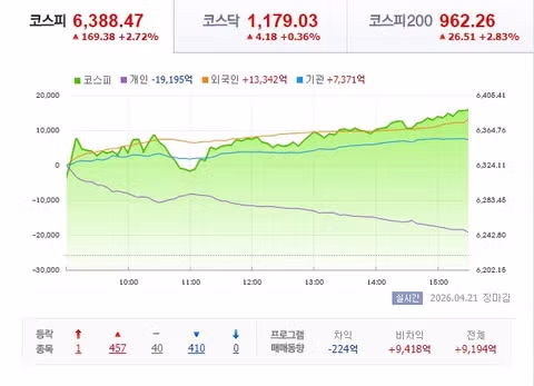 [속보]코스피, 2.72% 오른 6388.47 마감…사상 최고치 마감