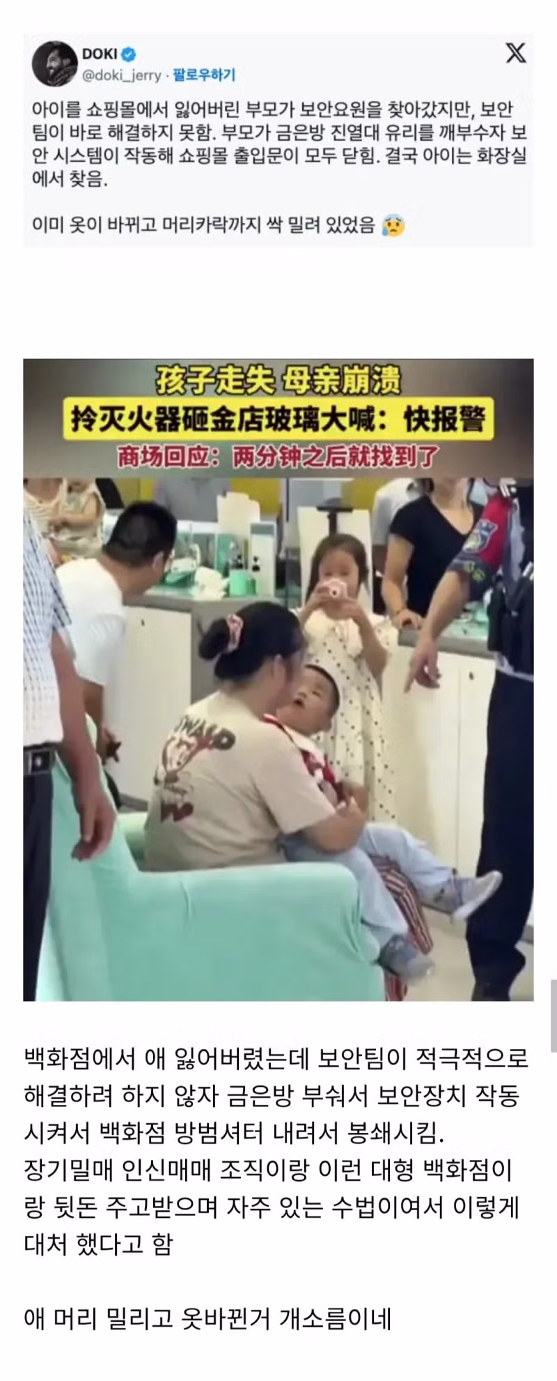 중국에서 한 엄마가 백화점의 금은방 유리를 부순 이유