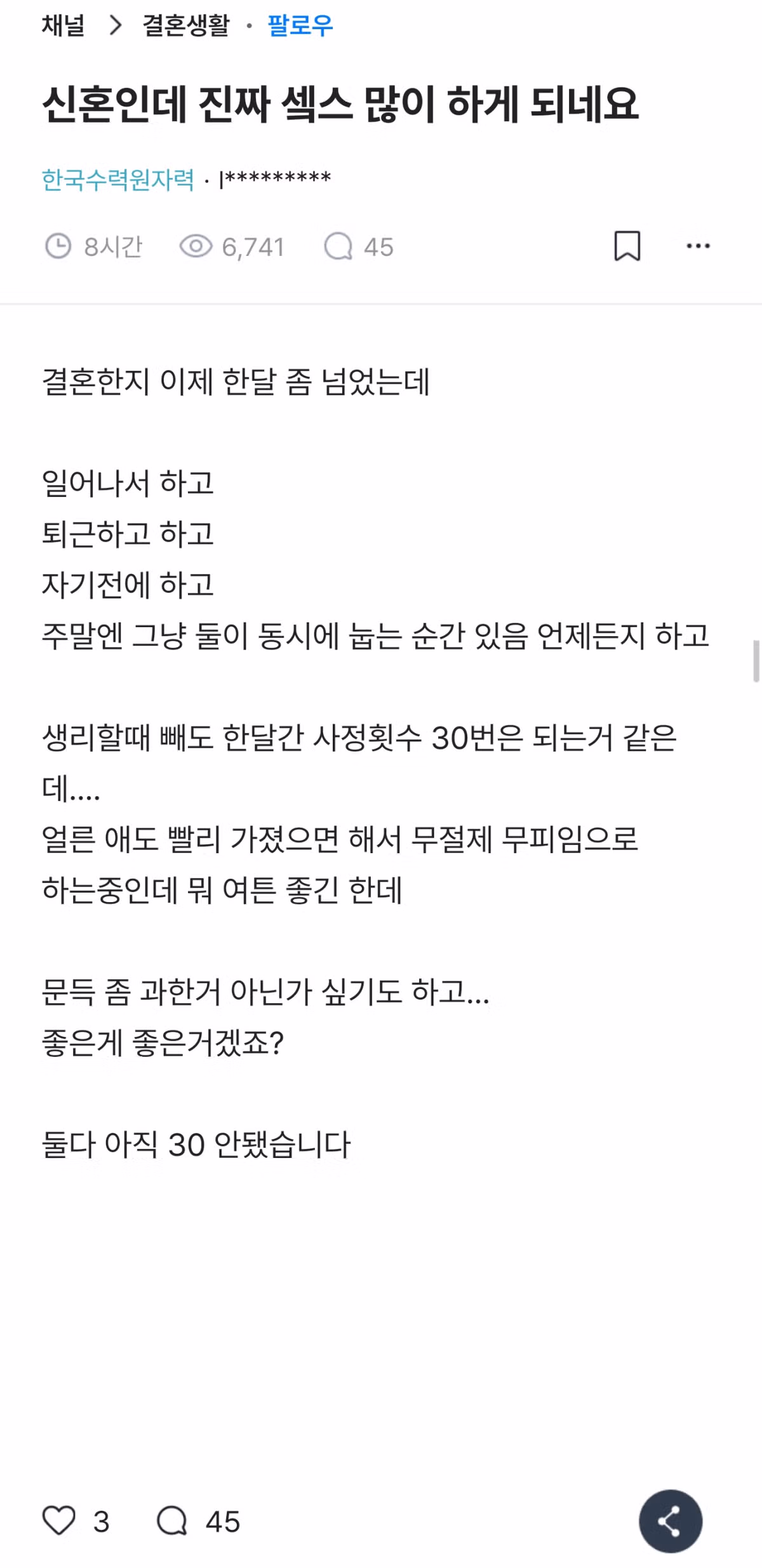 블라) 결혼 한달 넘은 신혼인데 성관계를 너무 많이 하는거 같아요