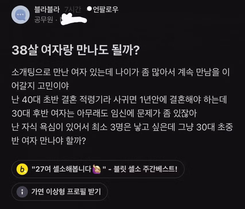 초산이라면 30후반이믄 자연임신 힘들듯 애있는 돌싱을 찾거나 젊은 여자랑 결혼 하려믄 국결이 현실적이지