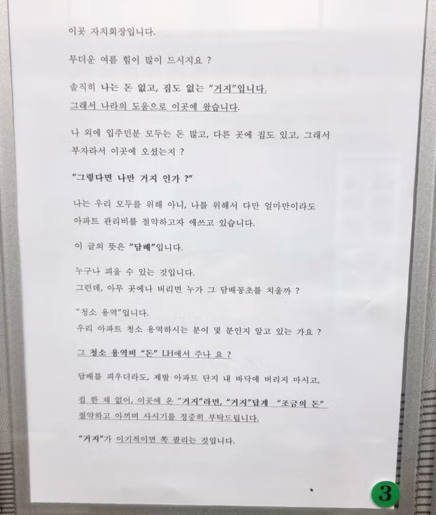 "거지면 거지답게 아끼며 살자"…임대 아파트에 붙은 자치회장 안내문.