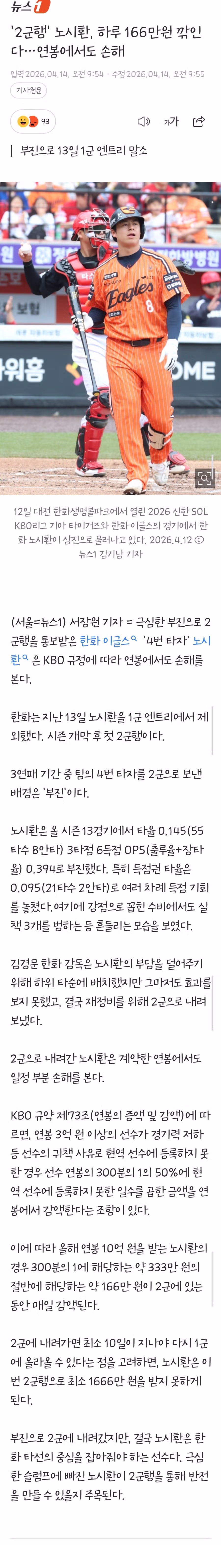 '2군행' 노시환, 연봉도 하루 166만원씩 깎인다.jpg