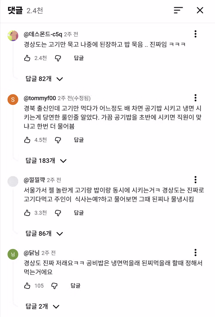 본인이 서울 토박이인데 고기만 먹고 밥먹는다면 부모님이 경상도거나 조부모님쪽에 경상도가 고향인 분이 있는거임