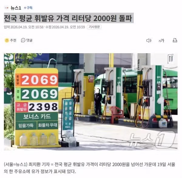 전국 휘발유 가격 리터당 2000원 돌파