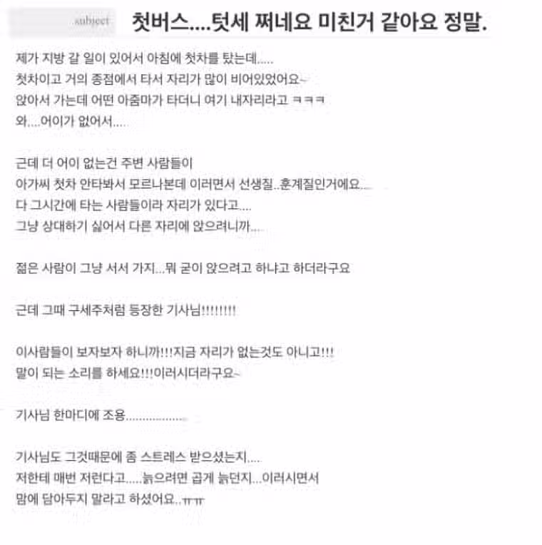 첫 버스, 텃세 쩌네요 미친거 같아요 정말