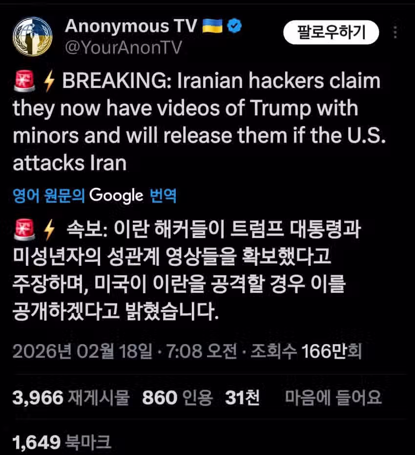 (속보) 이란 해커들, 트럼프와 미성년자의 성관계 영상들을 확보했다