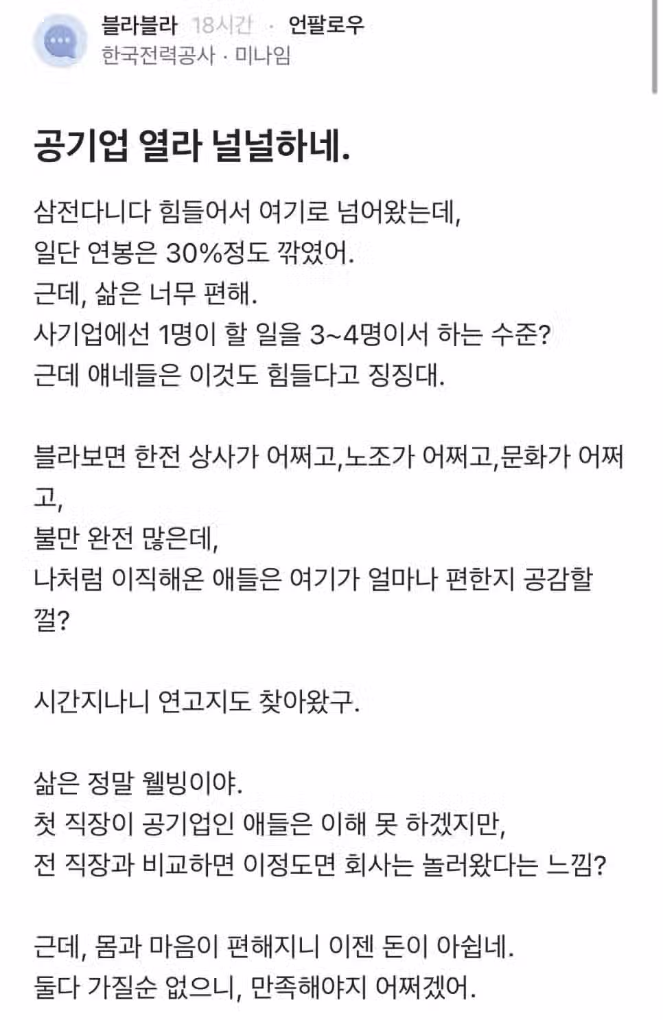 삼전 다니다 한전으로 이직해서 행복하다는 블라인