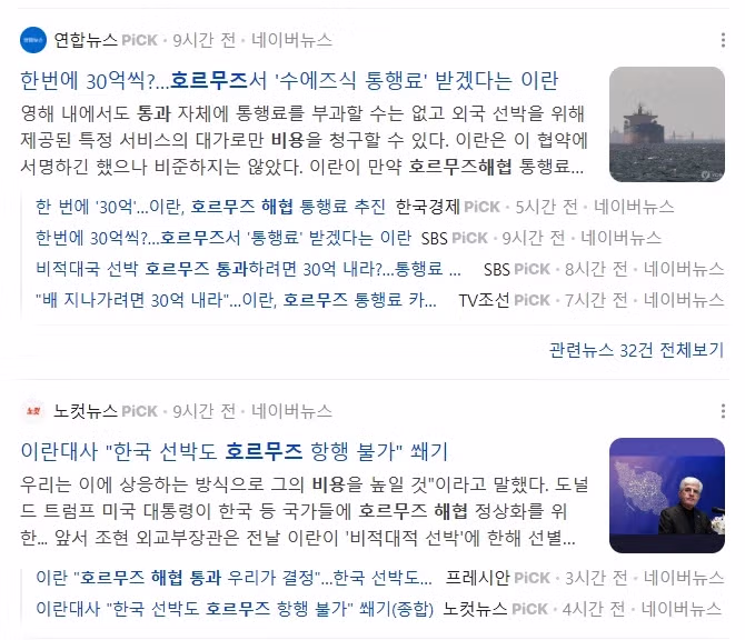 이란.. 해협 통과비용 30억 받겠다 선언