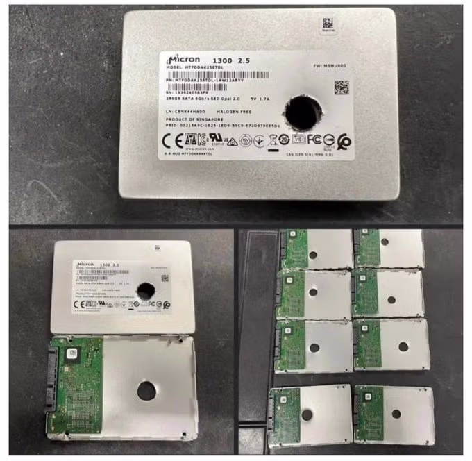 자료 유출 방지를 위해 구멍을 뚫어 폐기한 ssd