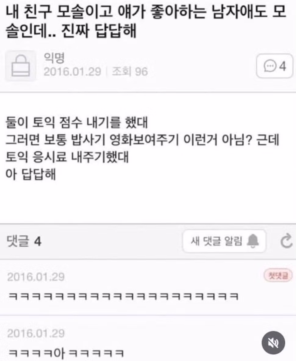 내 친구 모솔이고 얘가 좋아하는 남자애도 모솔인데 진짜 답답해