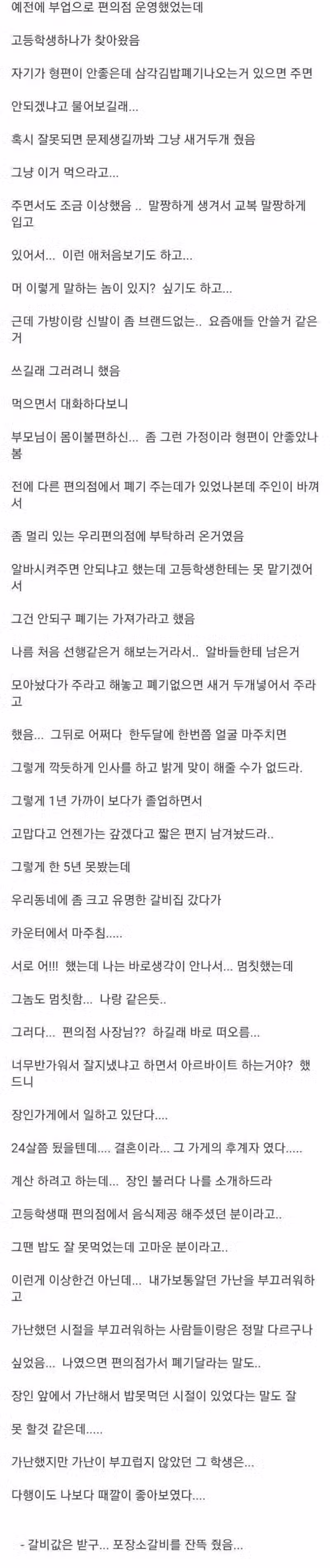 저소득층 학생에게 폐기 주고 갈비 먹은 편의점주