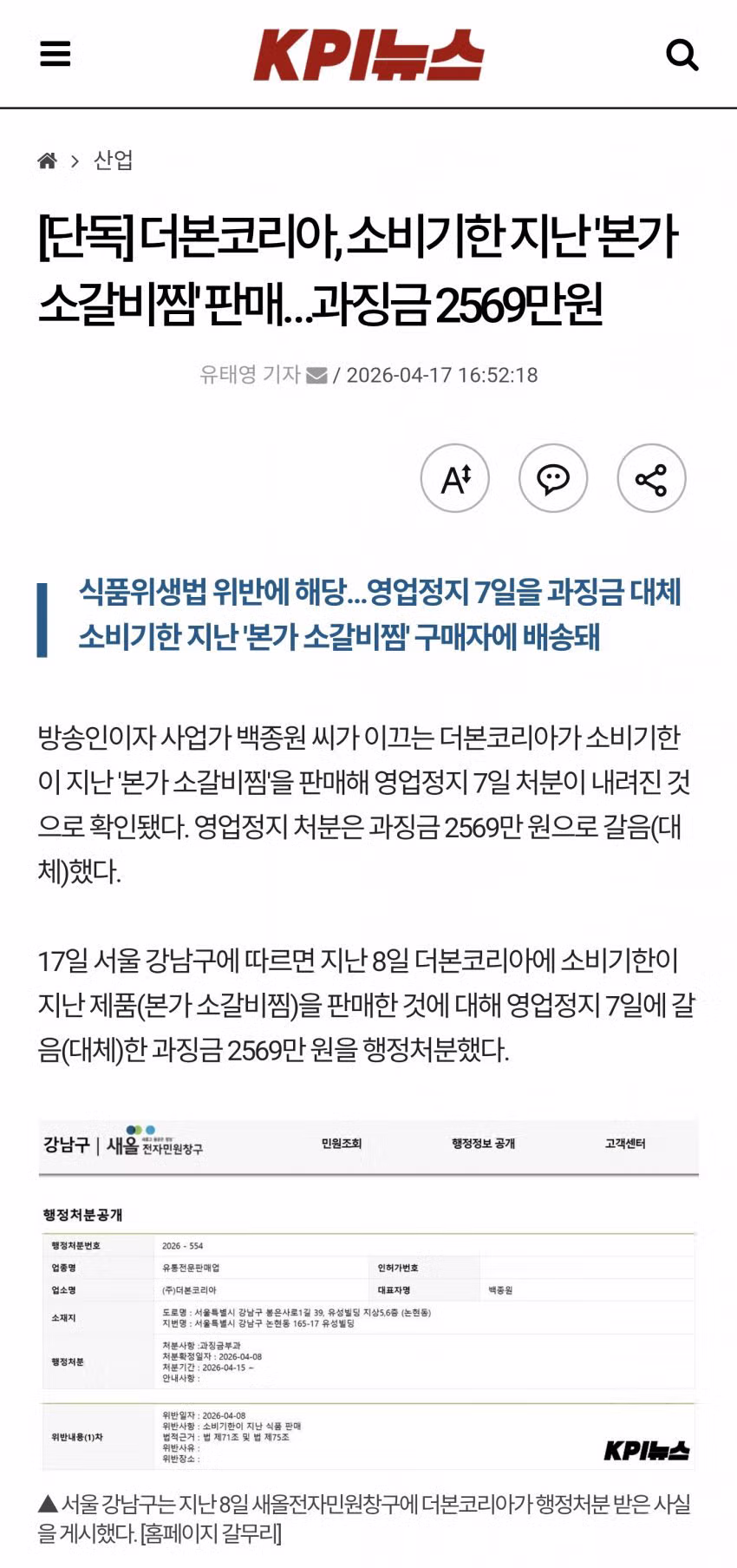 [단독] 더본코리아, 소비기한 지난 '본가 소갈비찜' 판매…과징금 2569만원