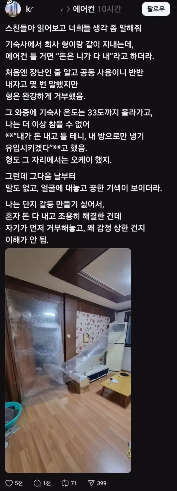 에어컨 틀 거면 돈 네가 다 내라는 기숙사 형