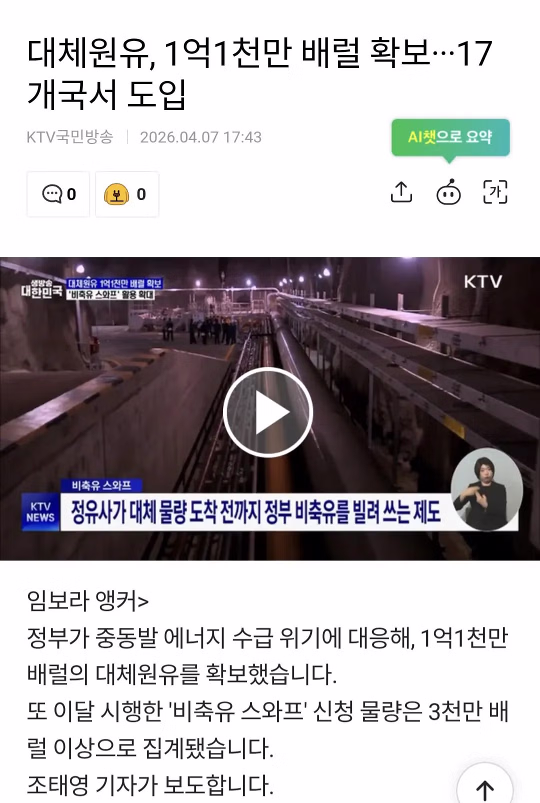 한국 원유 4.5월 도합 1억1천만 배럴 확보