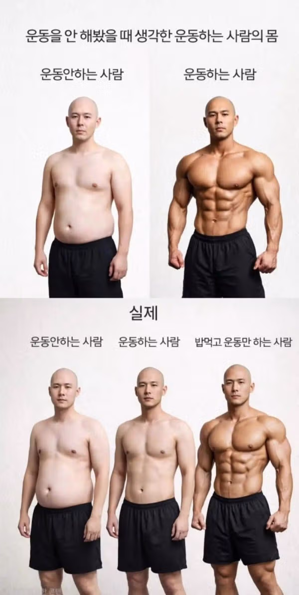 ㅋㅋㅋ 이거 레알.. 하루 한두시간 운동해서는 3번째처럼 안됨. 밥만먹도 운동만 해야 저리 됨.
