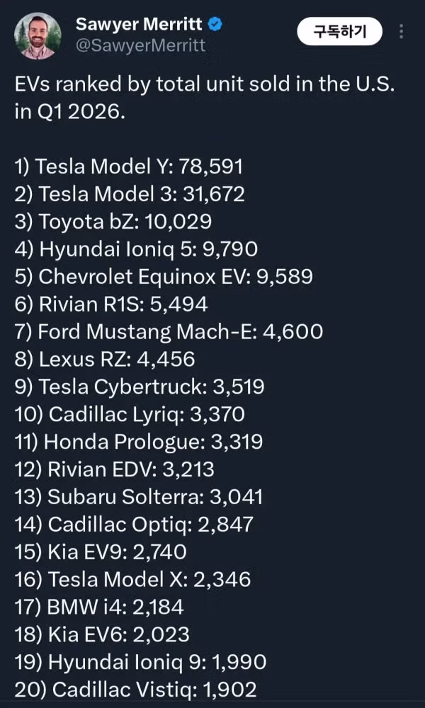 미국 1분기 전기차 판매량 순위