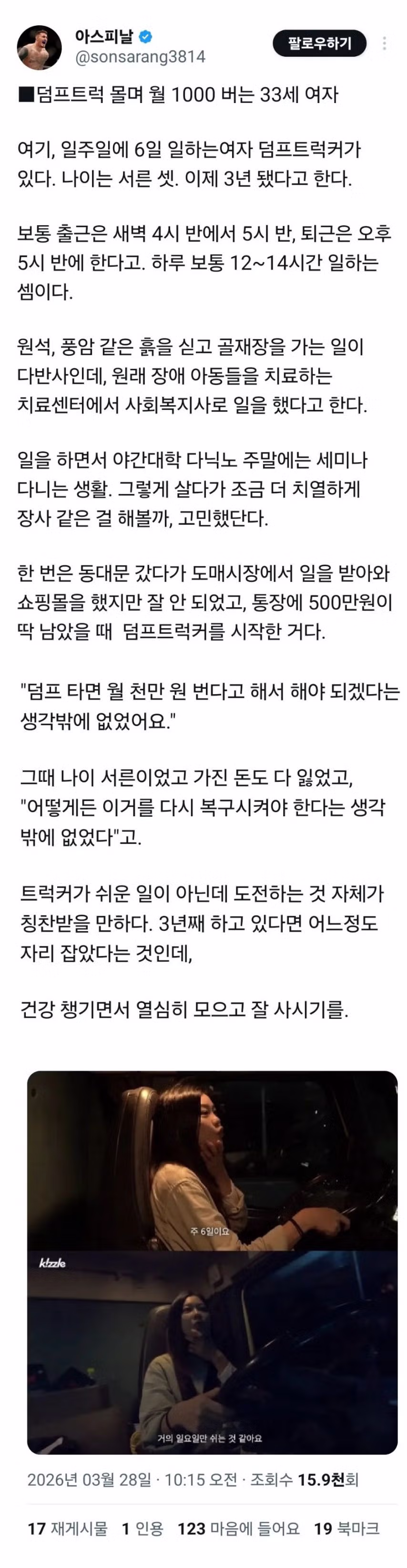 덤프트럭 몰며 월 1000 번다는 처자.