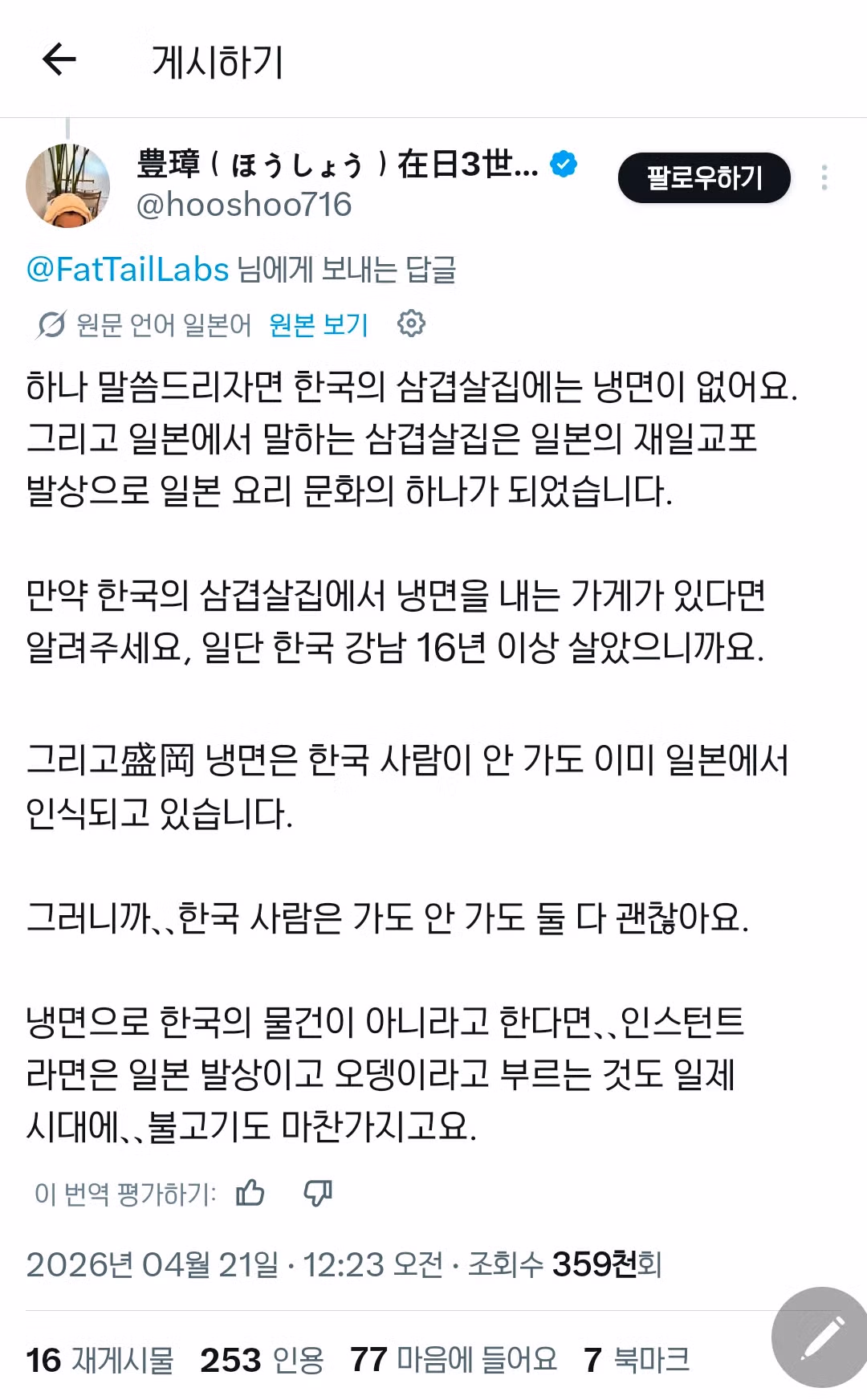 일본인: 한국에서 16년을 살았는데 고기집에 냉면있는걸 못봤다