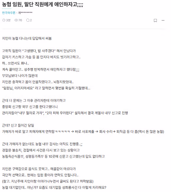 농협 임원, 말단 직원에게 애인하자고;;;;