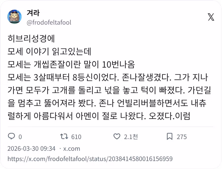 성경에 모세는 개씹존잘이란 말이 나온다