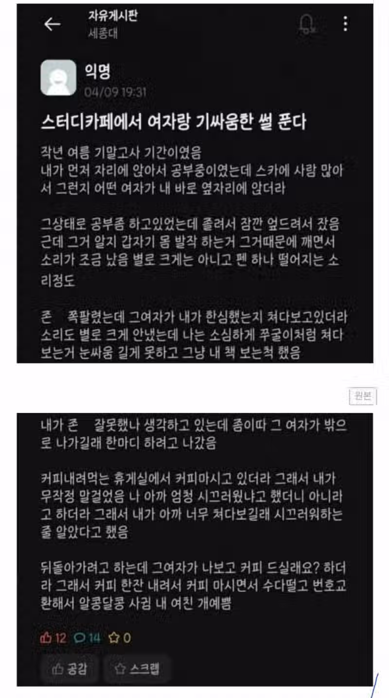 스터디카페서 여자랑 기싸움한 세종대생